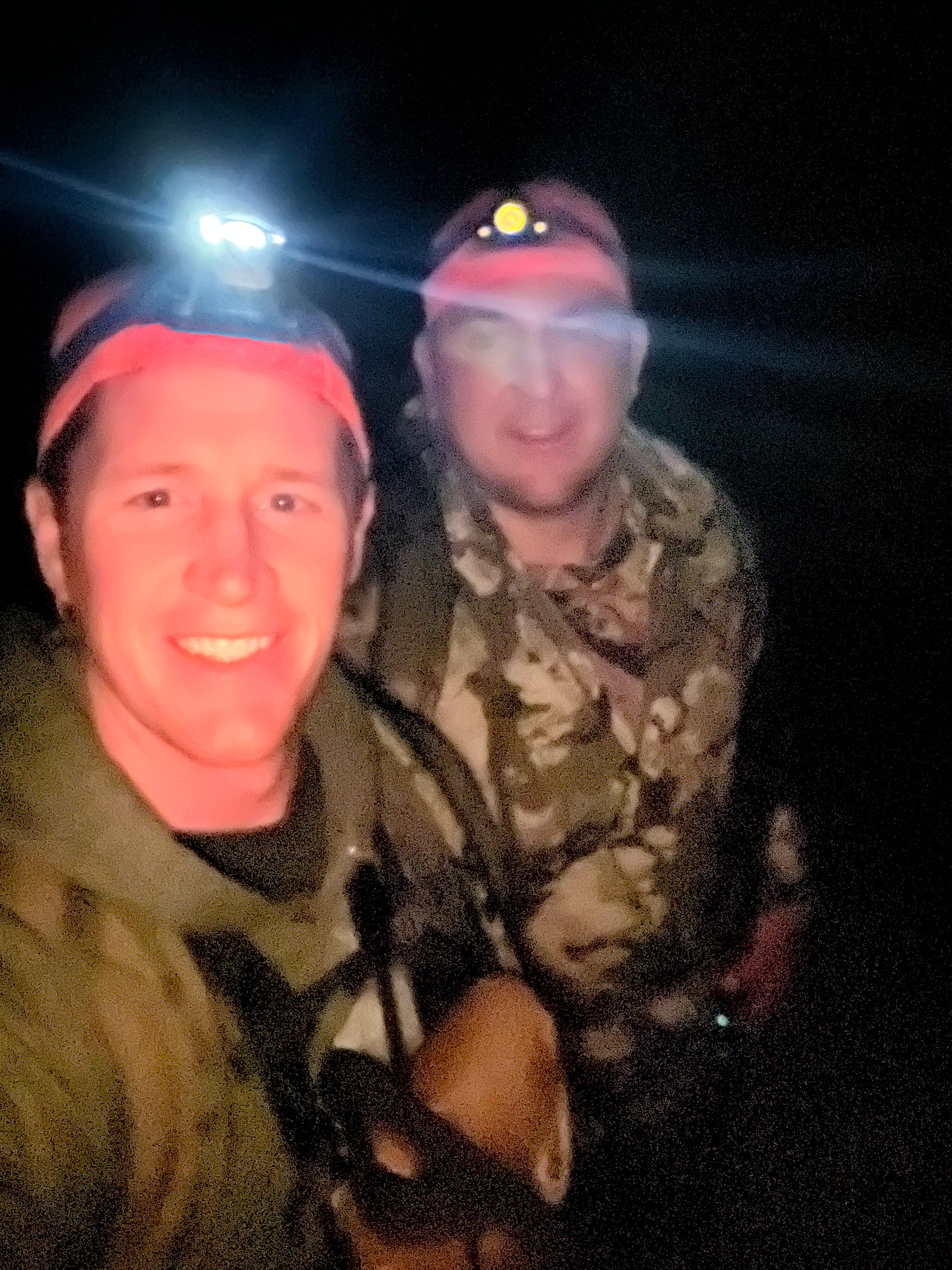 I’m not going to lie, I totally got spooked as we were trekking back after a good hunting session in the darkness. As we were walking back, I was in the lead, and saw this big black animal jump out in front of us and turned and stared us down. It was so dark that my first thought was that it was a black bear, only to find out that it was a moo cow. I will say, if I were to run into a bear, there would be no other person I’d rather run into a bear with than Dustin, who is a large as a bear himself.