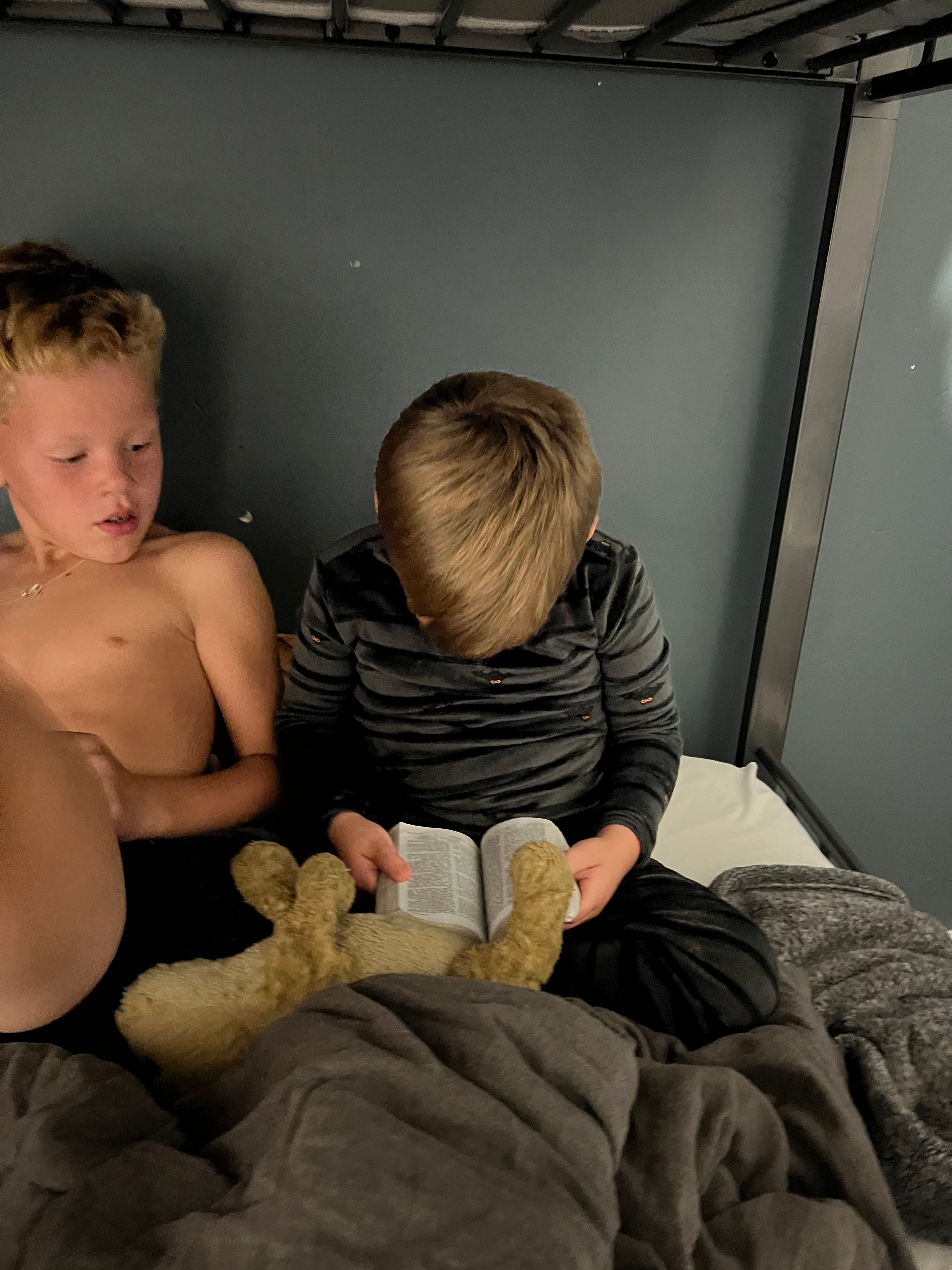 If you know Lou you’ll probably know he love carrying his little Book of Mormon around. One night, as we were trying to corral the kids and get them to bed, I couldn’t find Lou and low and behold he was in bed reading his Book of Mormon. I wish we could claim that Lauren and I are amazing readers of scriptures with our kids, but we are not. In fact, he can’t even read, but every night he opens it up and just like to look at the pages.
